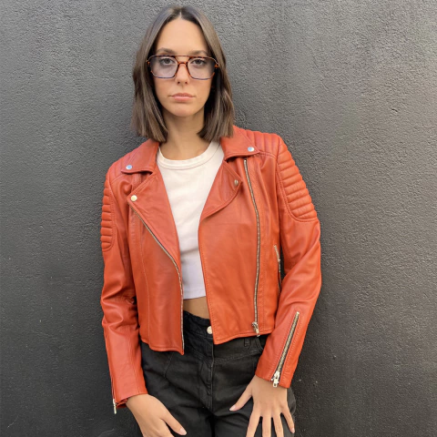 Campera de cuero, cierre de acceso diagonal. Hebillas en cintura.